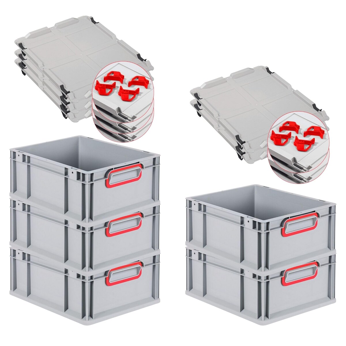 PROREGAL SparSet 5x Eurobox NextGen Color mit Auflagedeckel & Verschlüsse, HxBxT 17x30x40cm, 16L, Grau, Griffe rot zu, Eurobehälter, Box