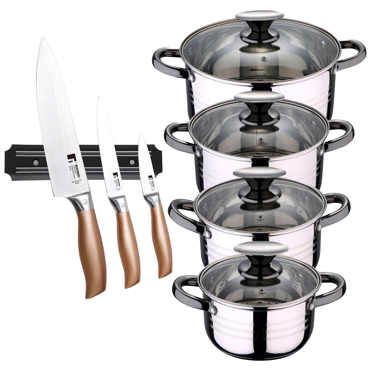 BERGNER - DINA 8-teiliges Kochgeschirr-Set (16/18/20/24cm) aus Edelstahl, induktions, mit einem Set aus 3 Messern und einer magnetischen Wandhalterung