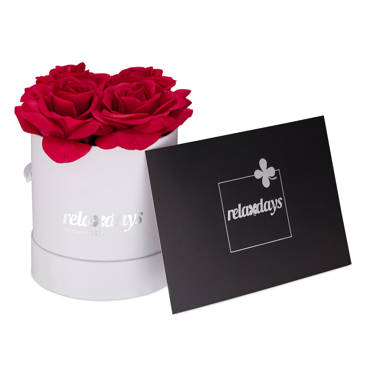 Relaxdays Rosenbox rund, 4 Rosen, stabile Flowerbox weiß, lange Haltbarkeit, Geschenkidee, dekorative Blumenbox, rot