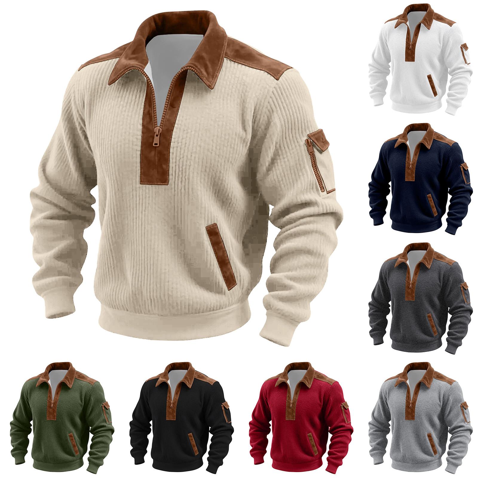 Men's Solid Color Corduroy Zipper Neck Long Sleeve Top Men's Casual Lapel Top cm Dark blue