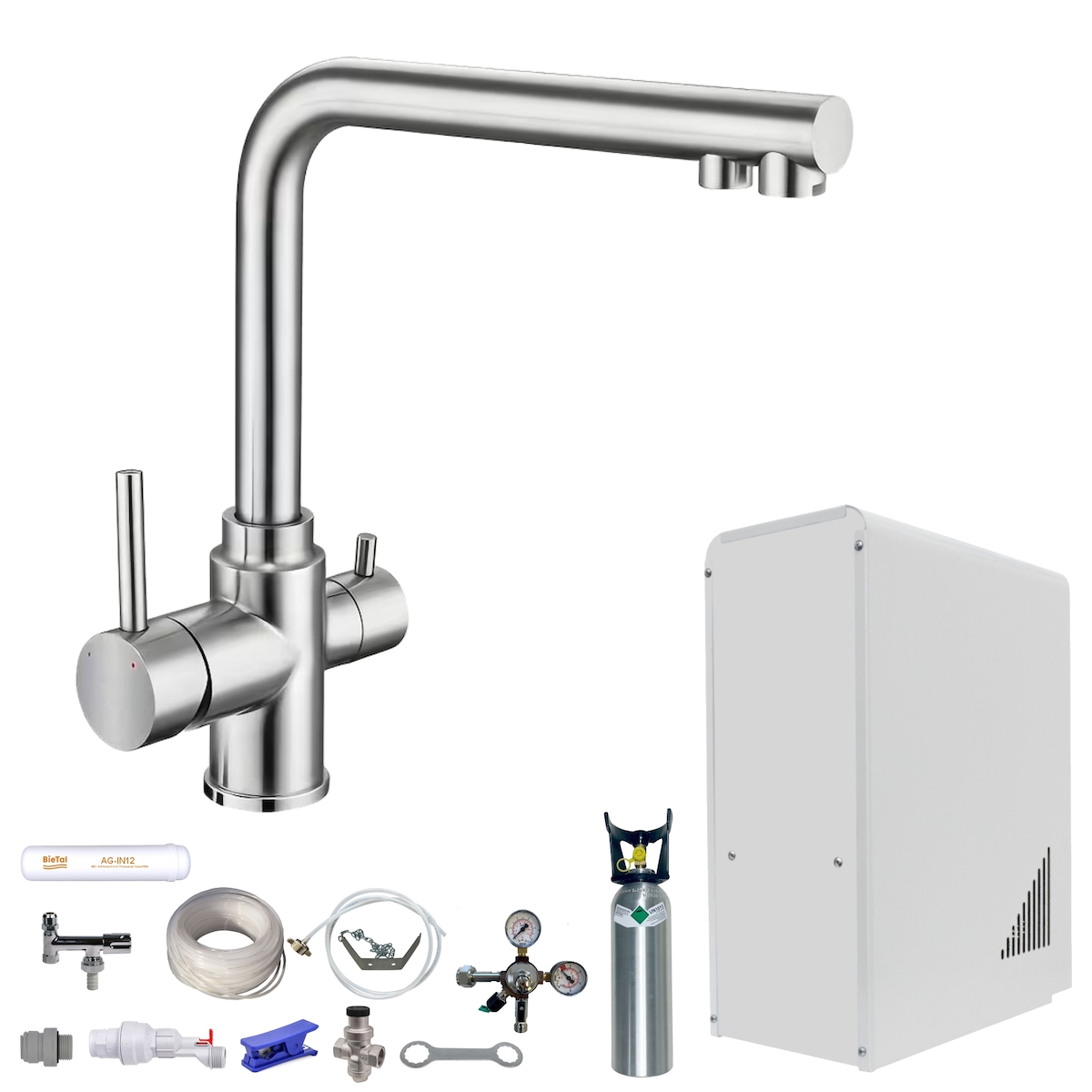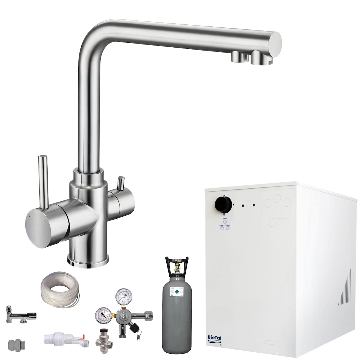 Sprudelwasser Tafelwasseranlage BieTal® BT-10U 3-Wege L Hahn Edelstahl & 2kg CO2
