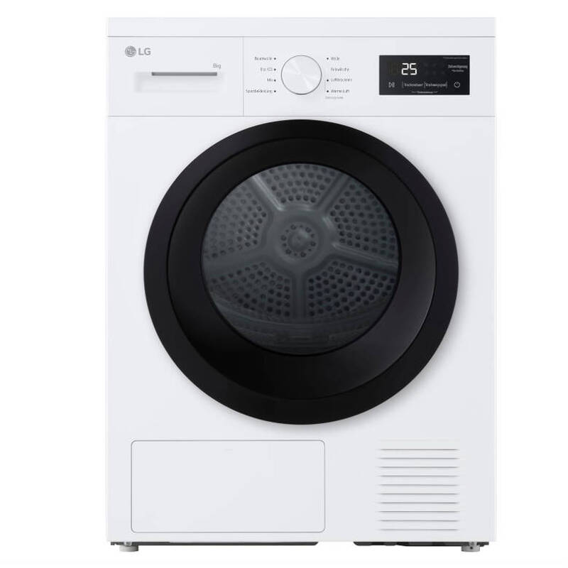 LG RT80B2 Kondensationstrockner, 8 kg, Dual Inverter Wärmepumpe, Sensor-Trocknung, LED-Touch-Display, Startzeitvorwahl, Trommelbeleuchtung, Edelstahl, 8 Programme, Weiß [Energieklasse D]