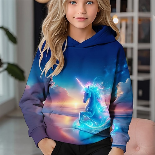 Ragazze 3D Unicorno Felpa con Cappuccio Manica Lunga Autunno Inverno Moda Adorabile Essenziale Bambini 4-12 Anni Con cappuccio All'aperto Casuale Quotidiano Vestibilità regolare