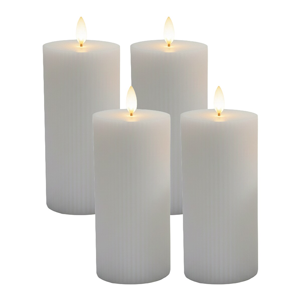 Relaxdays LED Kerzen, 4er Set, HxD: 18 x 7,5 cm, flackernde Flamme, Echtwachs, Rillen, flammenlose Blockkerzen, hellgrau