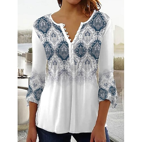 Per donna Plus Size maglietta Color Block Essenziale Manica lunga A V Maglie lunghe Informale Fine settimana Bottoni Tunica fluente Blu Arancione Verde Grigio Autunno inverno