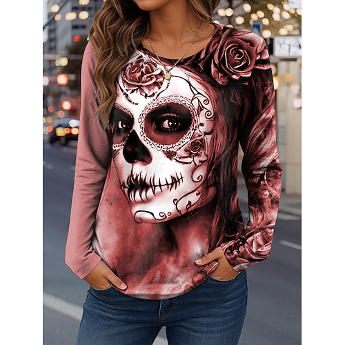 T Shirt Donna Teschi Grafica Moda Casual Manica Lunga Collo Regolare Maglie Quotidiane Stampa Weekend Rossa Blu Viola Verde Khaki Primavera Autunno Inverno