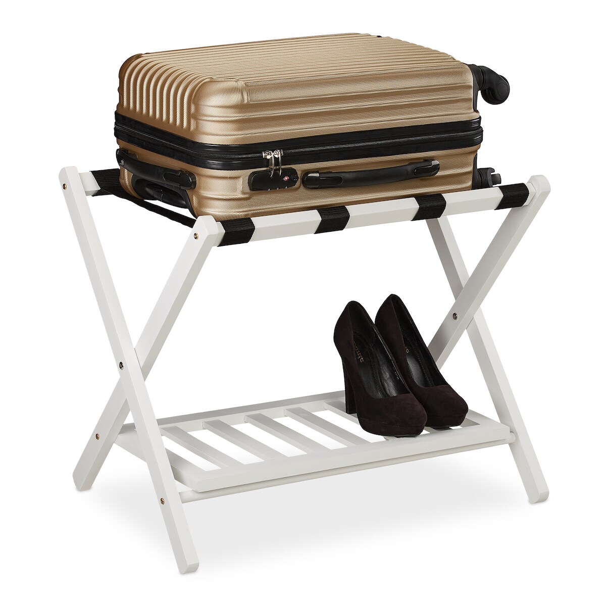 Relaxdays Kofferständer klappbar, Kofferhocker Holz, HBT: 54,5 x 66 x 44,5 cm, 2 Ablagen, Kofferaufbewahrung Hotel, weiß