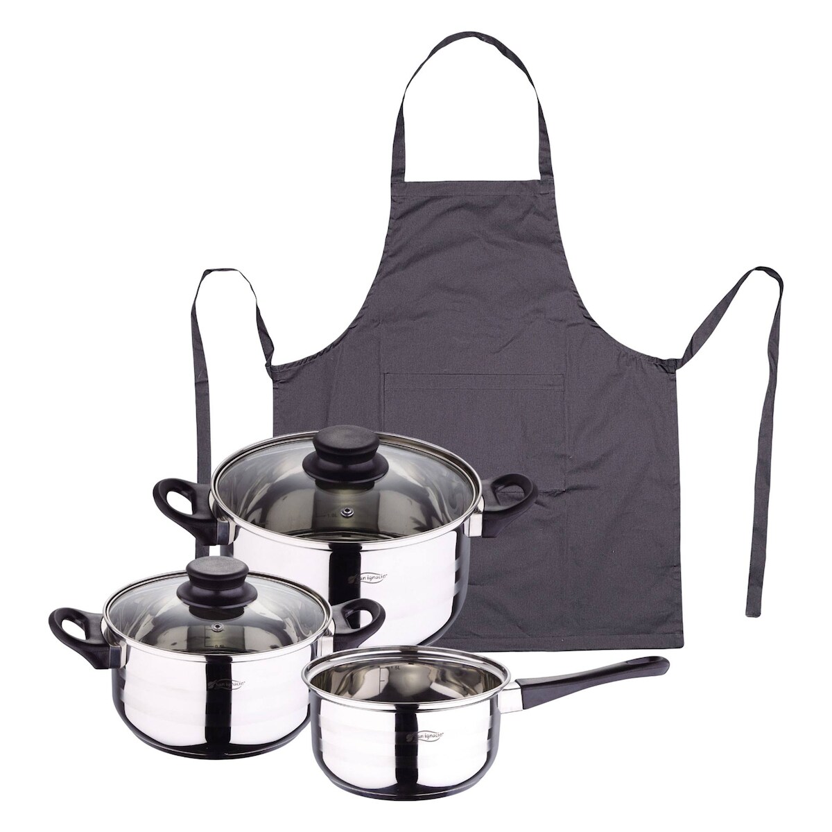 BERGNER - 5-teiliges Kochgeschirr-Set 16/18/20cm aus Edelstahl, induktionsgeeignet, mit einer dunkelgrauen Küchenschürze aus 100 % Baumwolle 75x80cm