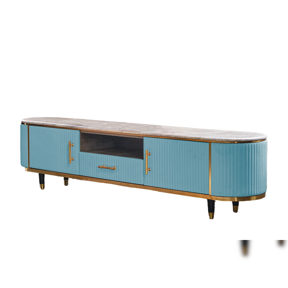 KAWOLA Lowboard MARIA TV-Bank Marmorplatte Kunstleder hellblau