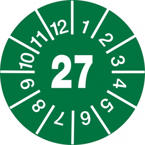 König Werbeanlagen Jahresprüfplaketten ab 27, Jahresfarben, Folie, Ø 10 - 30 mm - Bogen = 10 Plaketten - 15 mm Folie selbstklebend