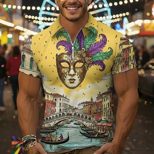Per uomo Polo Polo con zip a un quarto Quotidiano Carnevale Zip a un quarto Manica Corta Moda Essenziale Grafico Maschera Stampa 3D Estate Primavera Vestibilità regolare Giallo Rosso Viola Polo