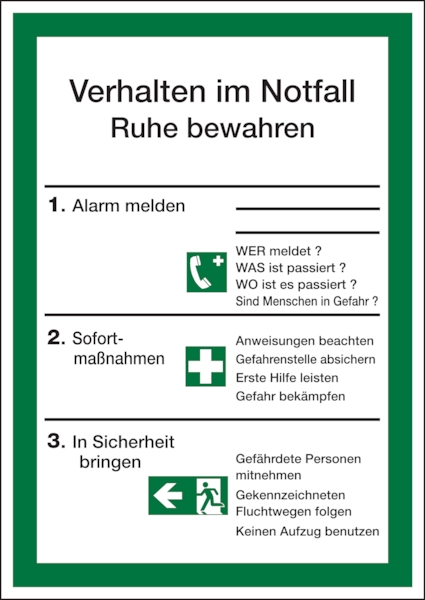 Aushang, Verhalten im Notfall - ISO 7010 - 210x297x1.5 mm Kunststoff