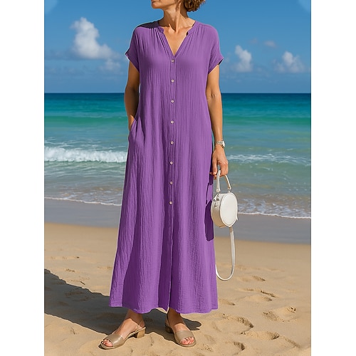 Per donna Nero Bianco Rosa Estate Primavera Abito maxi 100% cotone Abito Bianco Abito Camicia Casual Quotidiano Vacanza Vestibilità comoda Semplice Scollo a V