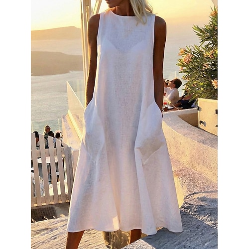 abito midi da donna senza maniche tasche casual silhouette a trapezio scollatura rotonda bianco estivo versatile vestibilità regolare comodo leggero traspirante abbigliamento abbigliamento