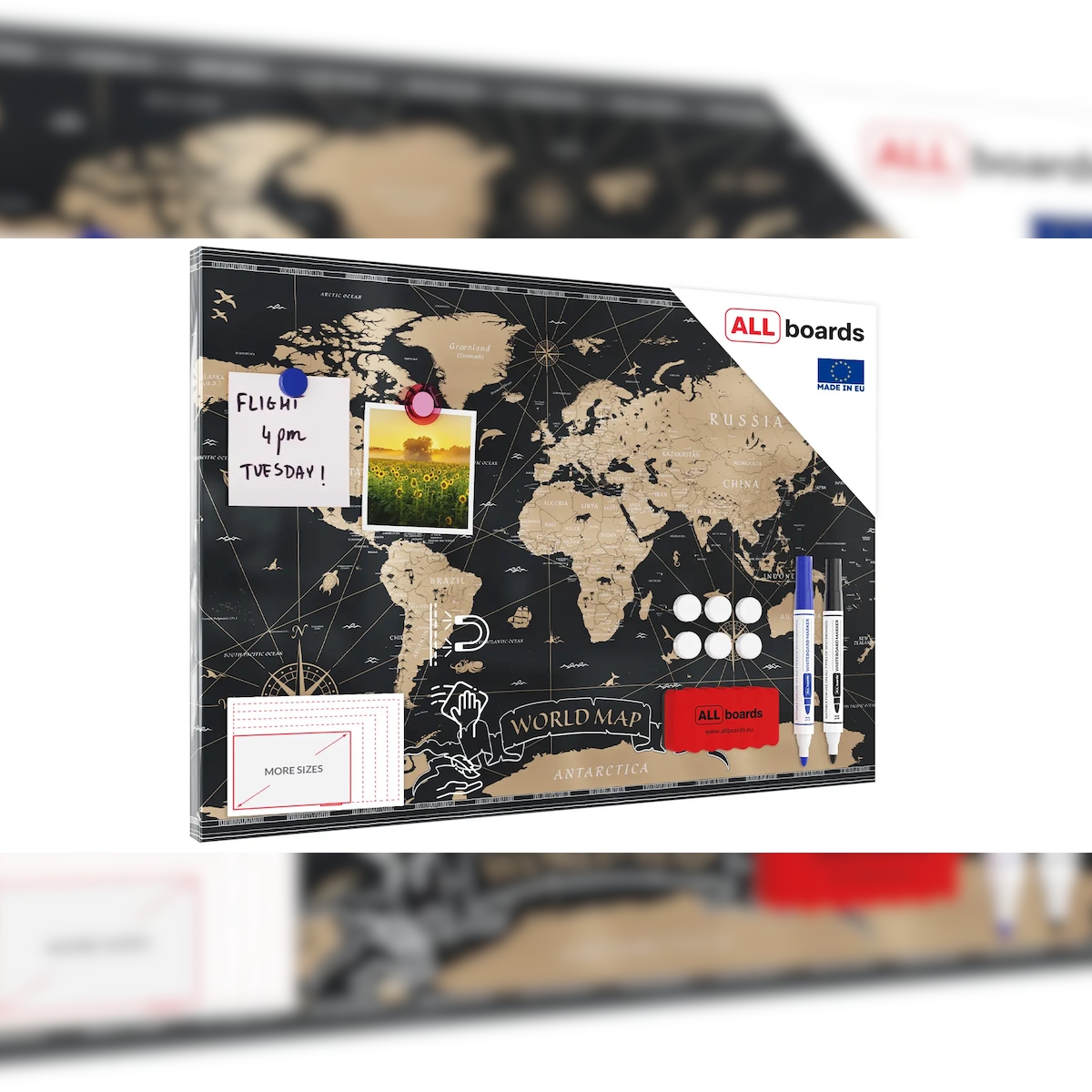 ALLboards Metallische Magnettafel WELTKARTE SCHWARZ 60x40cm Memoboard für jede Art von Magneten Magnetpinnwand + 4 Marker, 10 Magnete und Schwamm