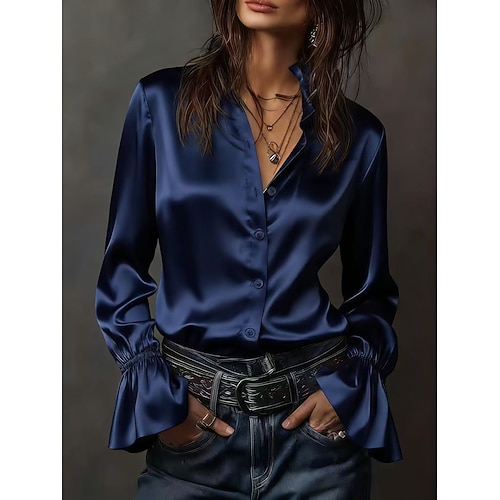 Per donna Camicia in raso Camicia elegante Blusa Volant Tinta unica Elegante Essenziale Casual Manica Lunga Colletto a Camicia Top Regolari Quotidiano All'aperto Lavoro Nero Bianco Rosa Rosso