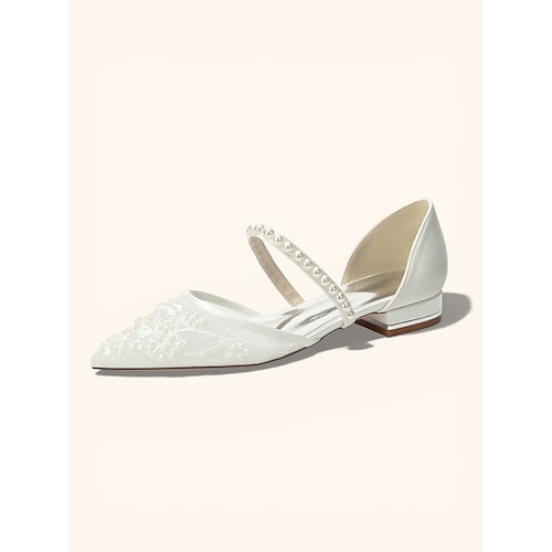 Scarpe da sposa da donna con tacco basso, cinturino in pizzo color avorio e perle, eleganti e comode ballerine per la sposa, per matrimonio all'aperto in giardino