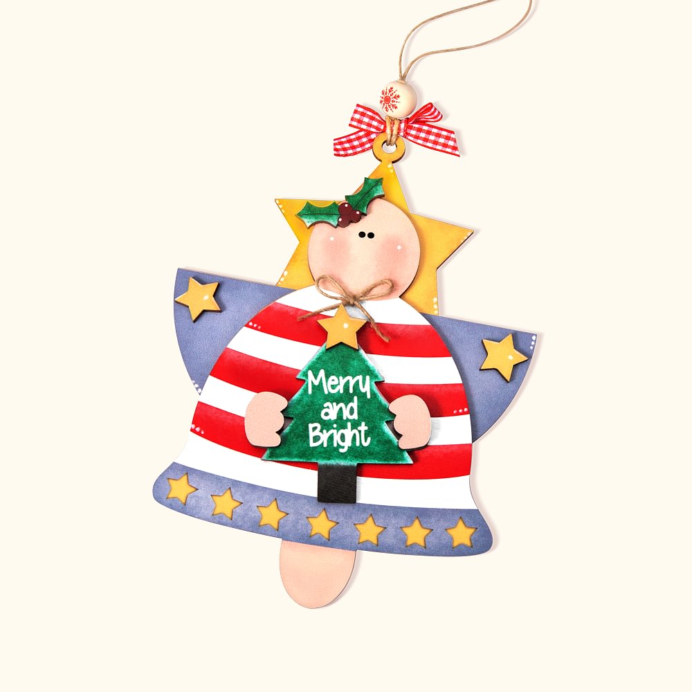 Ornamento di legno personalizzato dell'angelo di Natale Forma di campana tintinnante Tema di vacanza Ornamento da appendere con perline Papillon Regal