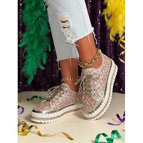 scarpe da ginnastica con plateau e glitter oro rosa da donna, scarpe da festa con lacci scintillanti per le feste di carnevale