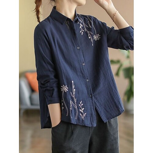 Per donna Camicie di cotone e lino Ricamato Bottoni Floreale Vintage Elegante Essenziale Manica Lunga Colletto a Camicia Top Regolari Quotidiano Blu Bianco Estate Primavera Autunno