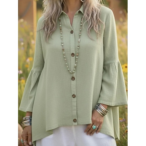 Per donna Camicia Finto cotone e lino Bottoni Semplice Quotidiano Elegante Essenziale Manica 3/4 Colletto a Camicia Top Regolari Quotidiano Lavoro Ferie Blu Nero Bianco Primavera Autunno