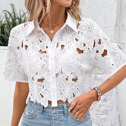 Per donna Camicia Estiva Camicia casual Blusa Traforato Taglio Bottoni Elegante Casual Manica Corta Collo ripiegato Top Regolari Quotidiano Ferie Abbigliamento da vacanza Bianco Estate Primavera