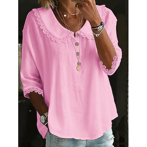 Per donna Blusa Tinta unica Elegante Casual Manica 3/4 Colletto a Camicia Top Regolari Quotidiano Bordo in pizzo Blu Bianco Giallo Rosa Estate Primavera Autunno