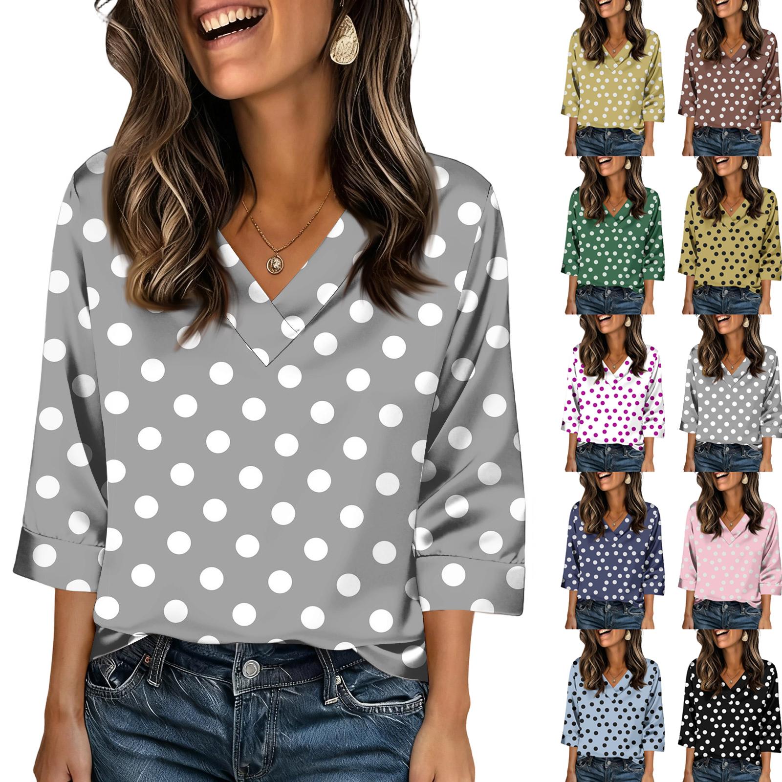 Dam 3/4-ärmar Skjortor V-ringning Satäng Lös Klänningsliknande Trendig T-shirt Pullover Blus Toppar cm