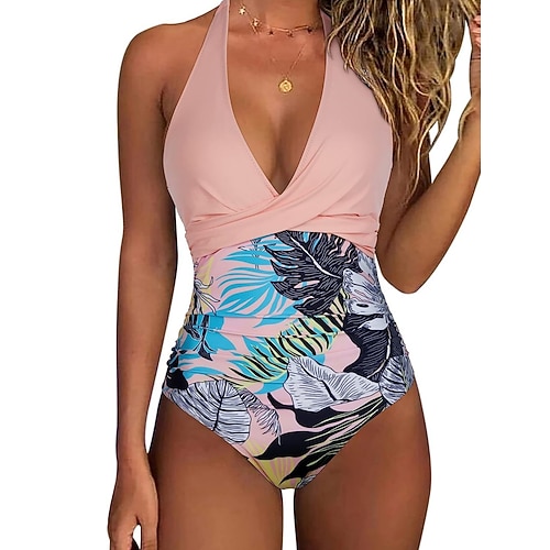 Costume da Bagno Intero da Donna Arricciato Leopardo Monokini Controllo Pancia Alta Vita Slim Senza Schienale Vacanza Spiaggia Fiori Collo Halter Senza Maniche