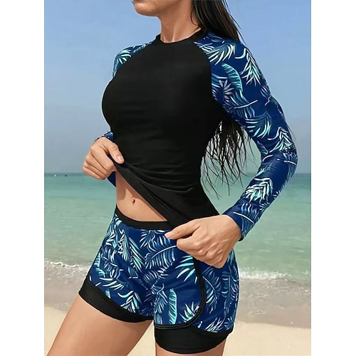 Costume da Bagno Due Pezzi da Donna Tankini Palma Alta Vita Controllo Pancia Alta Vita Slim Vacanza Spiaggia Fiori Foglie Collo Rotondo Maniche Lunghe