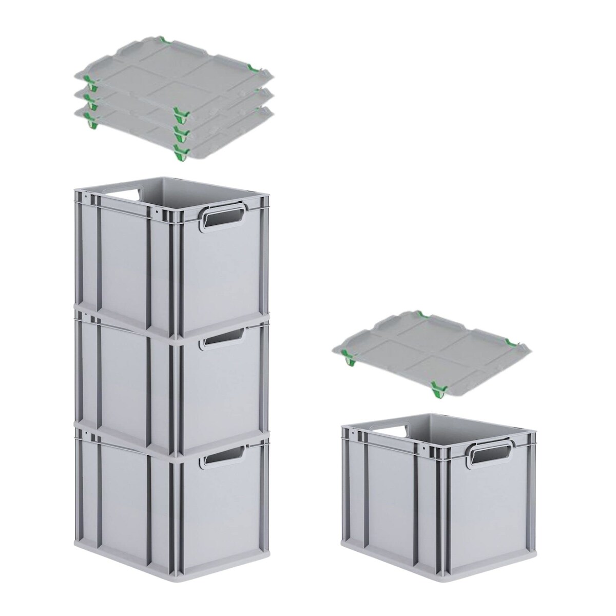 PROREGAL SuperSparSet 4x Eurobox NextGen Economy mit Auflagedeckel & 4x Verschlüsse Grün, Griffe offen, HxBxT 32x30x40cm, 30L, Eurobehälter, Box