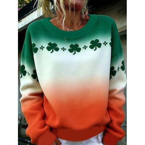 Felpa da donna con stampa trifoglio, casual, manica lunga, girocollo, regular, casual, street, abbigliamento quotidiano, verde scuro, arancione, verde, estate, primavera