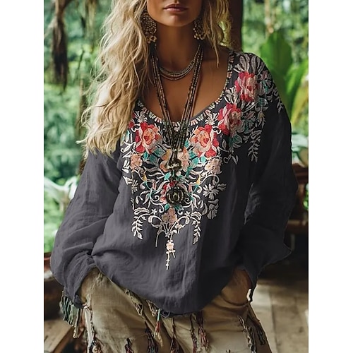 Per donna Camicia Camicia Boho Blusa Stampato Floreale Grafico Bohemien Elegante Classico Manica Lunga Scollo a V Top Regolari Quotidiano Ferie Uscire Grigio scuro Estate Primavera Autunno