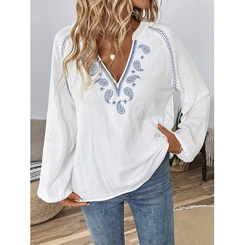 Per donna Camicia popover Camicia casual Blusa Ricamato Paisley Elegante Bohemien Casual Manica Lunga Scollo a V Top Regolari Quotidiano All'aperto Ferie Nero Bianco Blu marino Verde Estate Primavera
