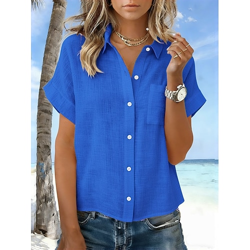 Per donna Camicia Abbottonare Blusa Finto cotone e lino Bottoni Tinta unica Elegante Casual Manica Corta Colletto a Camicia Top Regolari Quotidiano Blu Bianco Estate Primavera