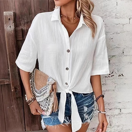 Per donna Camicia casual Camicia con Bottoni Blusa Arricciato Nodo frontale Bottoni Tinta unica Semplice Quotidiano Elegante Casual Mezza Manica Collo ripiegato Top Regolari Quotidiano Ferie