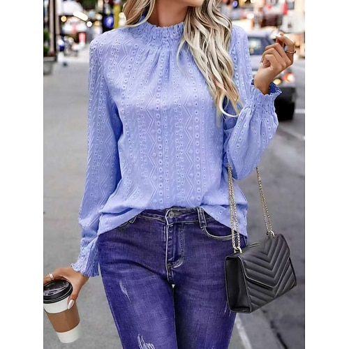 Per donna Camicia popover Camicia casual Blusa Traforato Tinta unica Elegante Essenziale Casual Manica Lunga Collo alla coreana Top Regolari Quotidiano All'aperto Ferie Blu Viola Verde Albicocca