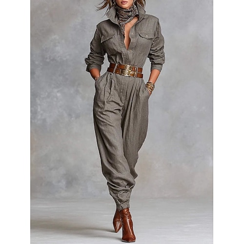 Per donna Normale Tuta Elegante Tinta unica Manica Lunga Colletto a Camicia Tasca Bottoni Quotidiano Casa Vestibilità regolare Grigio Primavera