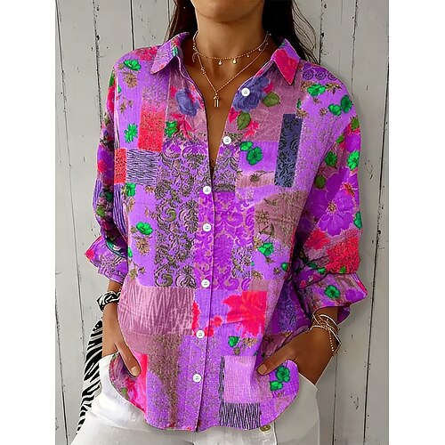 Per donna Camicia Blusa Bottoni Stampato Floreale Elegante Casual Manica Lunga Colletto a Camicia Top Regolari Quotidiano Blu Rosa Viola Arancione Estate Primavera