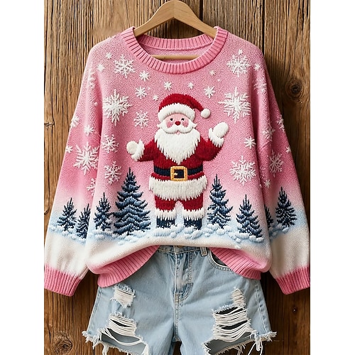 Maglione da donna di Natale con Babbo Natale e albero di Natale felpa grafica casual a maniche lunghe collo a costine lavorato a maglia stampa top regolari Knitted outdoor weekend rosa autunno inverno
