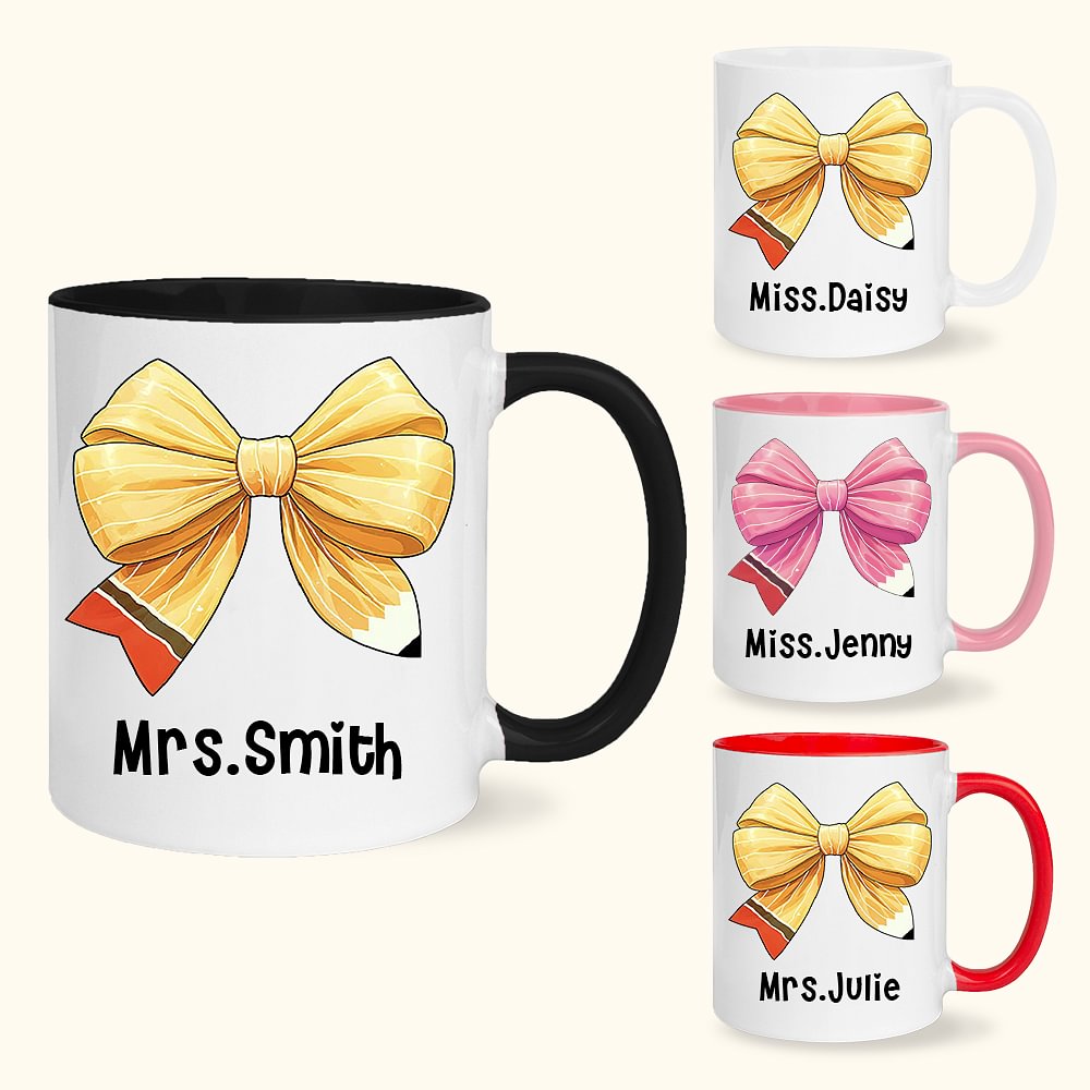 Taza de café de cerámica personalizada con nombre Pencil Coquette Bow 11oz Regalo de agradecimiento para el profesor en el Día del Maestro