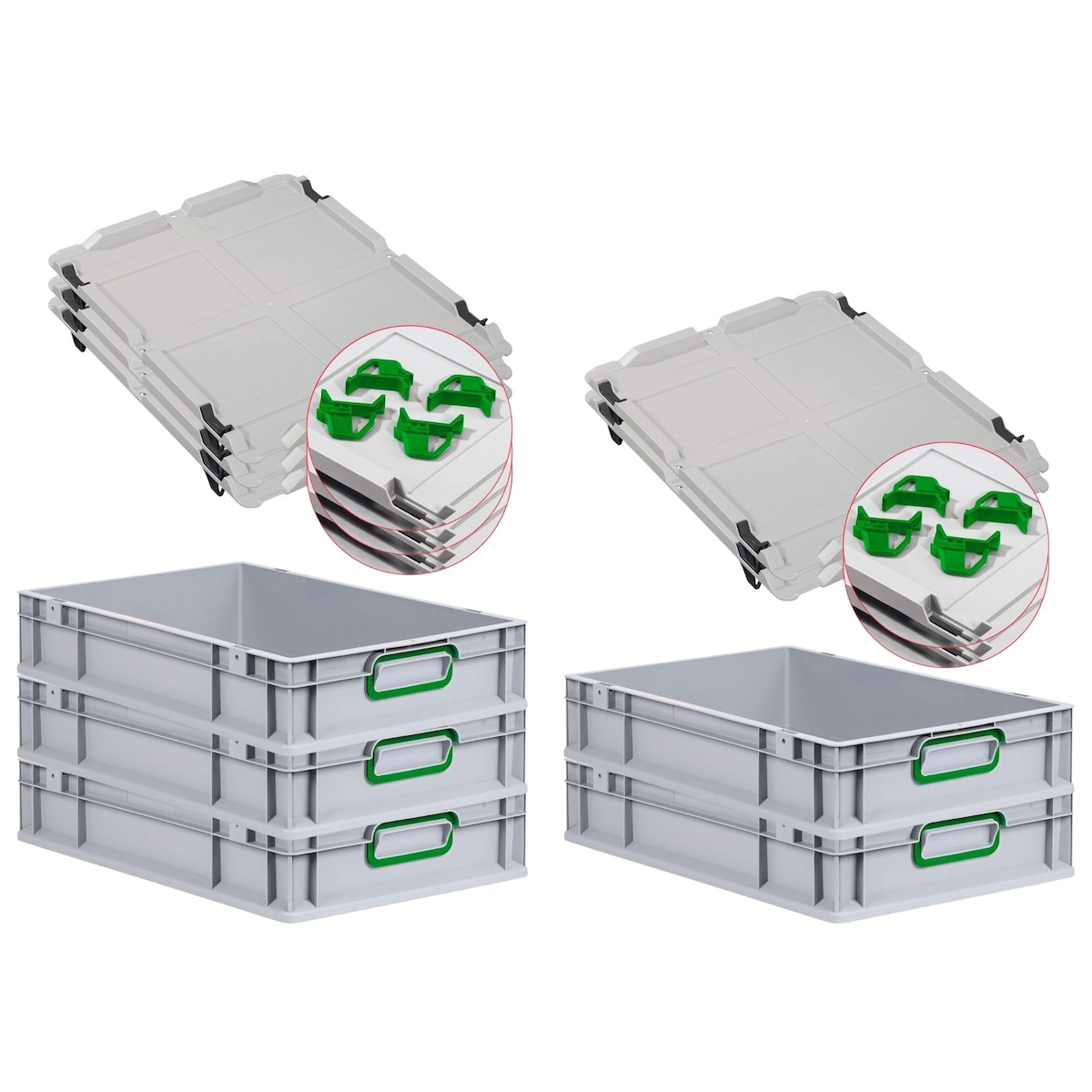 PROREGAL SparSet 5x Eurobox NextGen Color mit Auflagedeckel & Verschlüsse, HxBxT 12x40x60cm, 23L, Grau, Griffe grün zu, Eurobehälter, Box