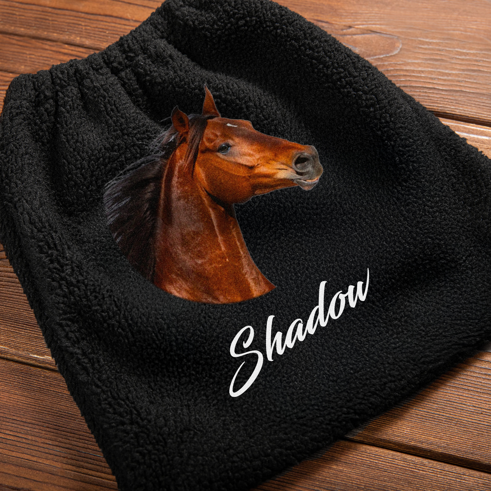 Personalisierte Pferd Foto Fleece Steigbügeldecke Tasche mit Namen Pferdesport Schutzausrüstung Satz von 2 Geburtstag Geschenk für Pferdeliebhaber Reiter