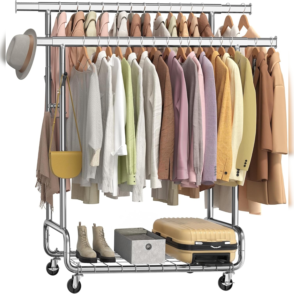 Schwerlast Kleiderständer auf Rollen bis 270 kg, mit Ablage und Haken, Garderobenständer, 2 ausziehbare Kleiderstangen, verstellbare Höhe, silbern