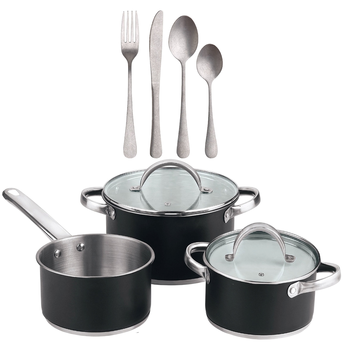 BERGNER - 5-teiliges Edelstahl-Kochgeschirrset (16/18/20cm), induktionsgeeignet, mit einem 16-teiligen Edelstahl-Besteckset