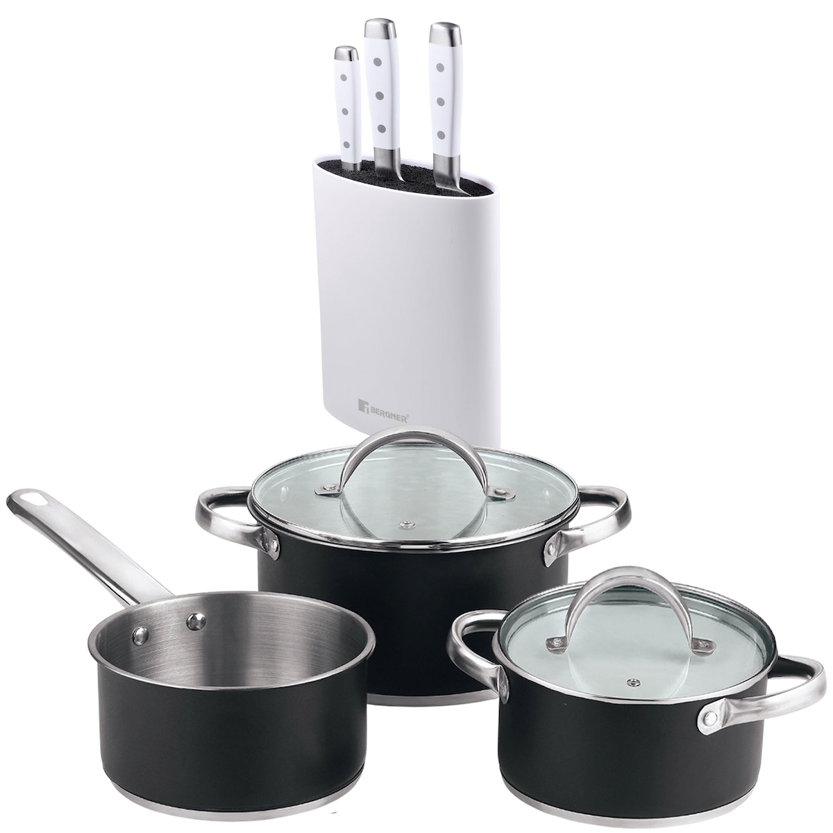 BERGNER - Kochgeschirr 5-teilig 16/18/20 cm aus Edelstahl, induktionsgeeignet, mit 3 Edelstahlmessern