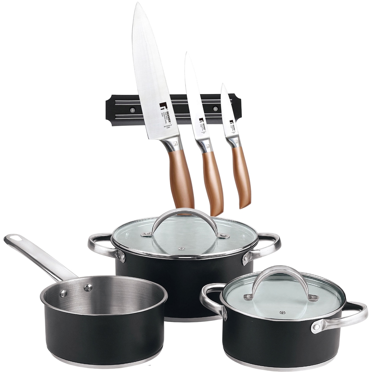 BERGNER - 5-teiliges Kochgeschirr-Set (16/18/20cm), für Induktion mit 3 Messern und einer magnetischen Wandhalterung aus Edelstahl