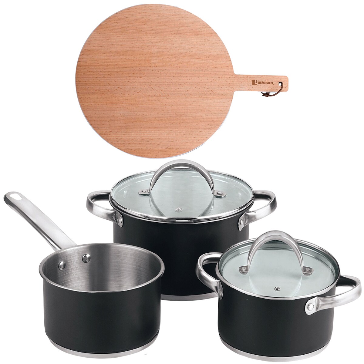 BERGNER - 5-teiliges Kochgeschirr-Set (16/18/20cm) aus Edelstahl, induktionsgeeignet, mit einem runden Schneidebrett aus Buchenholz (38x28x1,5cm)