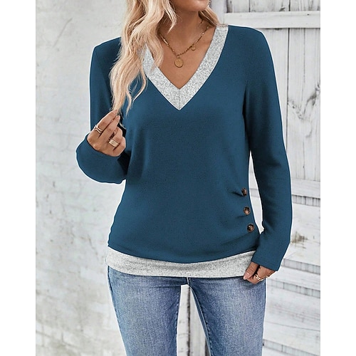 Per donna Blusa Semplice Elegante Casual Manica Lunga Scollo a V Top Regolari Quotidiano Uscire Weekend Patchwork Bottoni Nero Bianco Blu marino Blu turchese Autunno