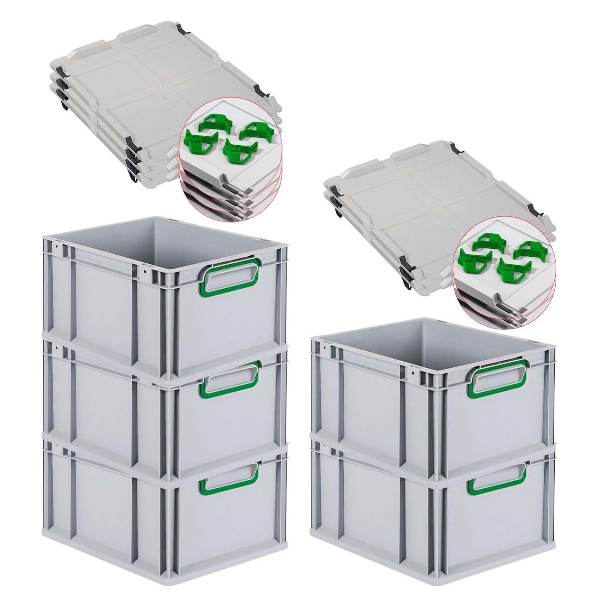 PROREGAL SparSet 5x Eurobox NextGen Color mit Auflagedeckel & Verschlüsse, HxBxT 22x30x40cm, 20L, Grau, Griffe grün zu, Eurobehälter, Box